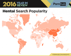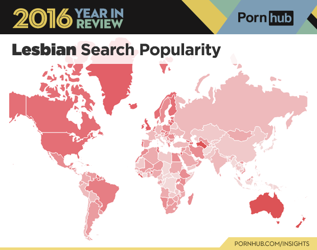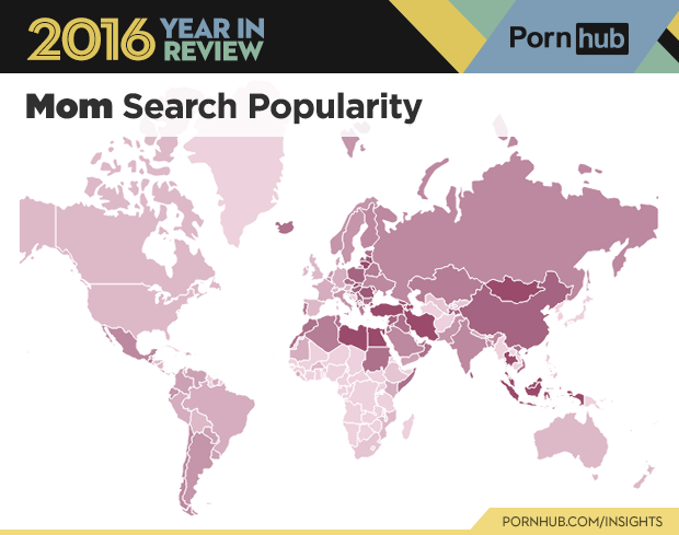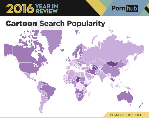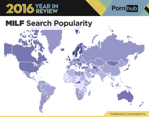 Curious to see where some of 2016’s top terms are most popular? Well we’ve put together a special gallery below, just for that. Some stand outs include ‘lesbian’ which is by far more popular in North America and Australia than anywhere else. ‘Hentai’ is shaded a dark orange in Asia (more specifically China, the Philippines, Thailand and Japan) where it is most popular. ‘Cartoon’ is gaining popularity worldwide, with more countries shaded in dark purple this past year compared to 2015. Interestingly enough ‘MILF’ is more popular in the Western hemisphere, while ‘mom’ is dominating the East.