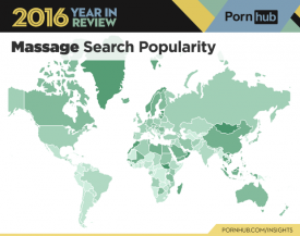 Next up let’s take a look at some of Pornhub’s most popular search terms from 2016! For the second year in a row ‘lesbian’ was the number one search term worldwide. ‘Step mom’ was second (up 1 spot from last year) followed by ‘MILF’ up 2 places from 2015. ‘Lesbian scissoring’ jumped a couple dozen positions to make the top 20 this year. An all-new term that shot into our top search terms lists of 2016 is ‘Overwatch’, in reference to the popular video game released earlier this year. Well known for its fast action and overtly sexualized characters, the game quickly became the subject of hundreds of fantasy porn parodies (nsfw) and tribute videos. “It appears that the trend is moving more toward fantasy than reality. ‘Generic’ porn is being replaced with fantasy specific or scenario specific scenes. Is this as a result of boredom or curiosity? One thing is certain; the typical ‘in-out, in-out’ no longer satisfies the masses, who are clearly looking for something different” notes Dr Laurie Betito, sex therapist and author of The Sex Bible for People Over 50″.