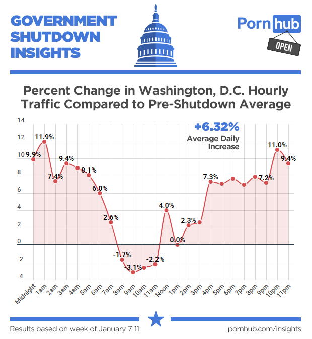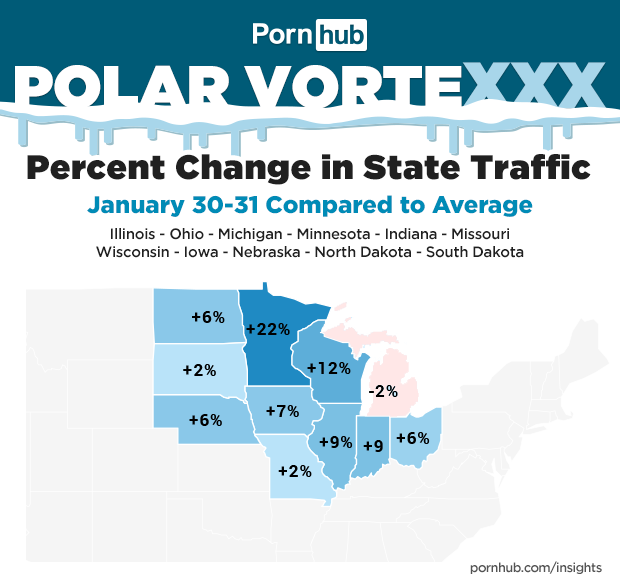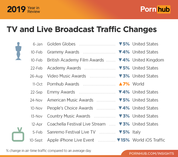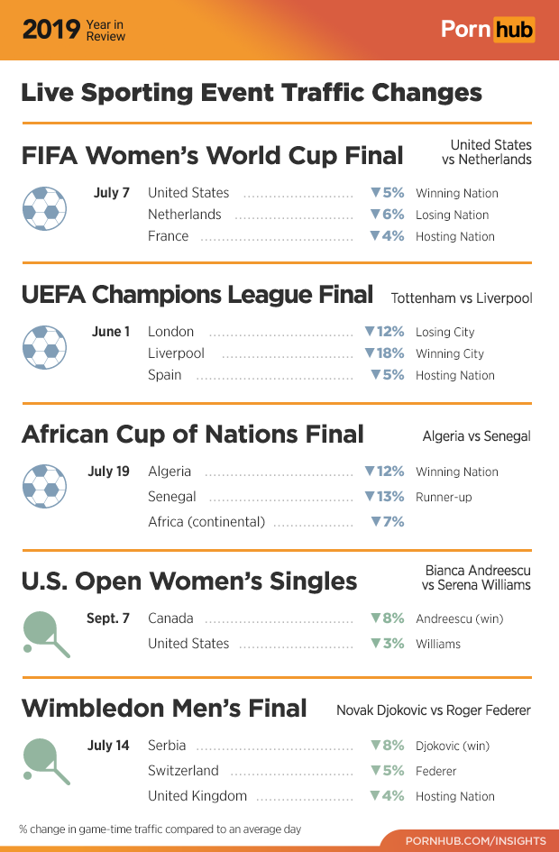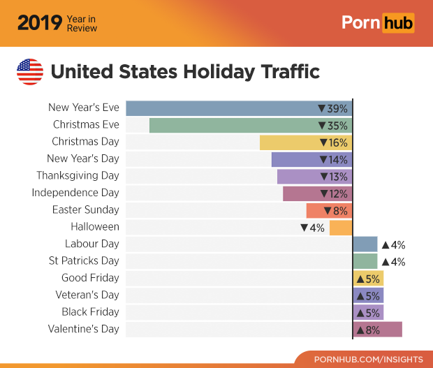 Next to New Years, Christmas Eve has the second highest holiday traffic drop in the U.S. by -35%, followed by a -16% drop on Christmas Day. With a little bit of loving on everyone’s minds, Valentines day caused an 8% increase in traffic to Pornhub this year. On Black Friday traffic increased by 5% as people were spending more time in front of their screens and needing a reprieve from shopping for their next bargain.