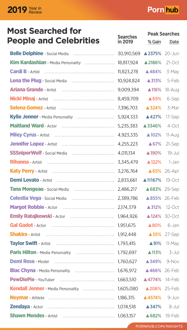 Belle Delphine came in at the #4 search that defined 2019, stunts with bathwater aside! Belle Delphine trolled her beloved followers when she dedicated a Pornhub page to ‘spoof’ NSFW videos that she uploaded in October of this year. To learn more, check out our list of top Celebrity Searches of this year!