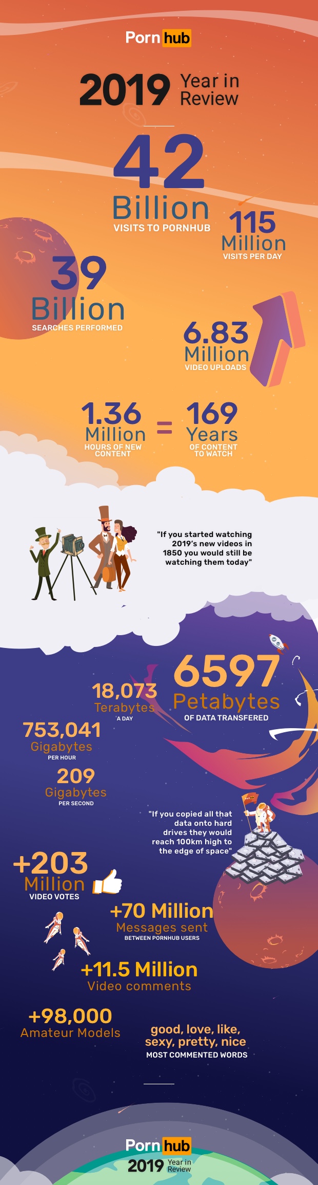In 2019 there was a record amount of video uploads, over 6.83 million new videos were uploaded to Pornhub. To put this in perspective – if you strung all of 2019’s new video content together and started watching them way back in 1850, you’d still be watching them today!