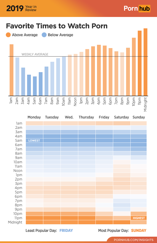 Worldwide, and indeed in most countries we have studied, Sunday is the most popular day to visit Pornhub, while Friday tends to have the lowest traffic. A lot of that has to do with the hours people prefer to watch porn. Peak viewing times are typically from 10pm to Midnight, but on weekends (as people tend to stay up later, go out more and sleep in longer), the viewing time shifts into the morning hours.