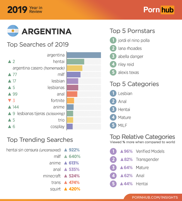 In 2019, ‘Argentina’ remained the top search among Argentinians, while searches for ‘MILF’ gained an impressive 77 spots, ‘anal’ gained 99 and ‘anime’ was up 144. Compared to the previous year, searches for ‘hentai sin censura’ (uncensored hentai) grew by 922%, ‘Minecraft’ grew by 524% and ‘trans’ by 474%.