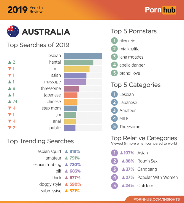 In 2019, ‘lesbian’ remained both the most viewed category and the most searched term among Australia’s visitors while searches for ‘hentai’ gained 2 positions to become the second most searched term. During the same time period, ‘threesome’ gained 3 positions, and ‘Chinese’ gained 74.