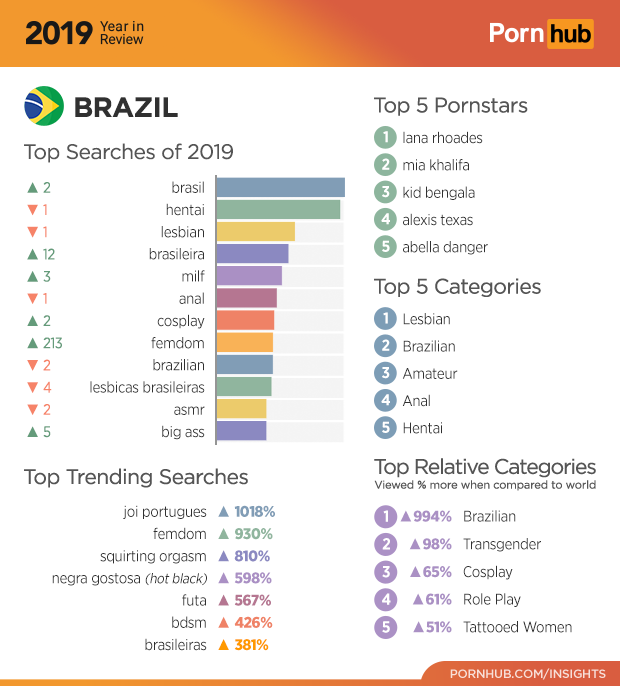 In 2019, searches for ‘Brasil’ moved up 2 spots to become Brazil’s number one search over ‘hentai’ and ‘lesbian’. During the same time period, searches for ‘Brasileira’ gained 12 positions and ‘femdom’ 213 positions. Compared to 2018, searches for ‘JOI Portugues’ (Jerk Off Instructions) grew by 1018%, ‘squriting orgasm’ by 810% and ‘negra gostosa’ (hot black) by 598%.