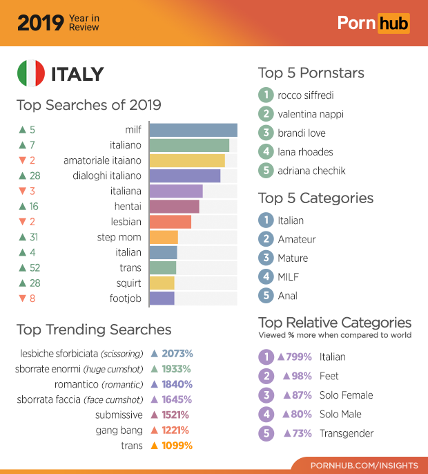 In 2019, ‘milf’ gained 5 positions to become Italy’s number one search term, followed by ‘Italiano’ up 7 from the previous year. Other top terms included ‘dialoghi Italiano’ (Italian dialog) up 28 to fourth, ‘hentai’ up 16, ‘trans’ by 52 and ‘squirt’ by 28.