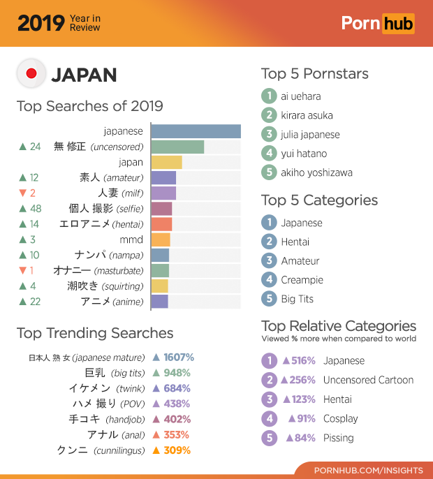 For 2019, ‘Japanese’ remains the number one search in Japan, while ‘uncensored’ moved up 24 spots to become the second most searched. As more of Pornhub’s video titles became translated, visitors were more often searching for videos using Japanese characters. This included ‘amateur’ increasing by 12, ‘selfie’ by 48 and ‘anime’ by 22. Another popular term which is unique to Japanese visitors is ‘nampa’ which is a type of flirting popular among Japanese people in their 20s and 30s.