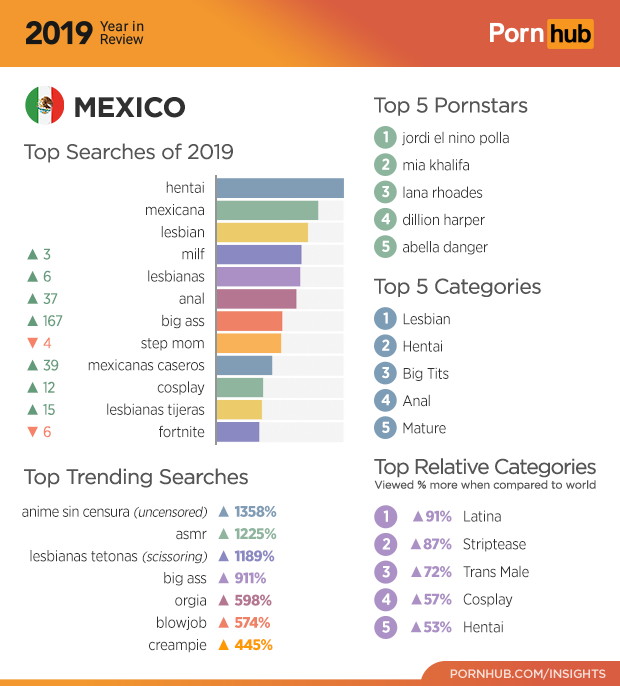For 2019, ‘hentai’, ‘mexicana’ and ‘lesbian’ remained the top three most searched terms in Mexico. Searches for ‘anal’ grew by 37, ‘big ass’ by 167 and ‘mexicanas caseros’ (homemade) by 39. Compared to the previous year, searches for ‘anime sin censura’ (uncensored anime) grew by 1358%, ‘asmr’ by 1225% and ‘big ass’ by 911%.