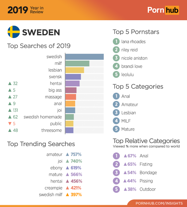 In 2019, Swedish visitors were still most likely to search for ‘Swedish’, followed by ‘MILF’ and ‘lesbian’. Searches for ‘hentai’, ‘massage’ and ‘JOI’ all saw big gains to become part of Sweden’s top 10 searches. Compared to the previous year, ‘amateur’ grew by 757%, ‘mature’ by 566% and ‘creampie’ by 421%.