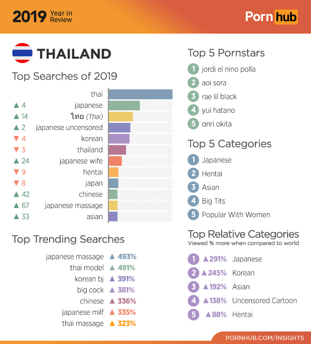 Searches for ‘Thai’ remain the number one search in Thailand, while ‘Japanese’ moved up 4 positions to become the number two search. Thai visitors also tend to search for other Asian content with top terms including ‘Korean’ and ‘Chinese’ which moved up 42 positions in 2019. When compared to the previous year, ‘thai model’ searches grew by 491%, ‘Korean BJ’ by 391% and ‘big cock’ by 381%.