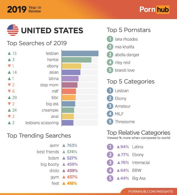 When compared to the previous year, our statisticians found that searches for ‘asmr’ grew by 763%, ‘bdsm’ by 527% and ‘big booty’ by 459%. The most searched pornstar in the United States was Lana Rhoades. When compared to other countries worldwide, visitors from the U.S. are 94% more likely to view the ‘Latina’ category, 77% more into ‘Ebony’ and 76% more into ‘Interracial’ porn.