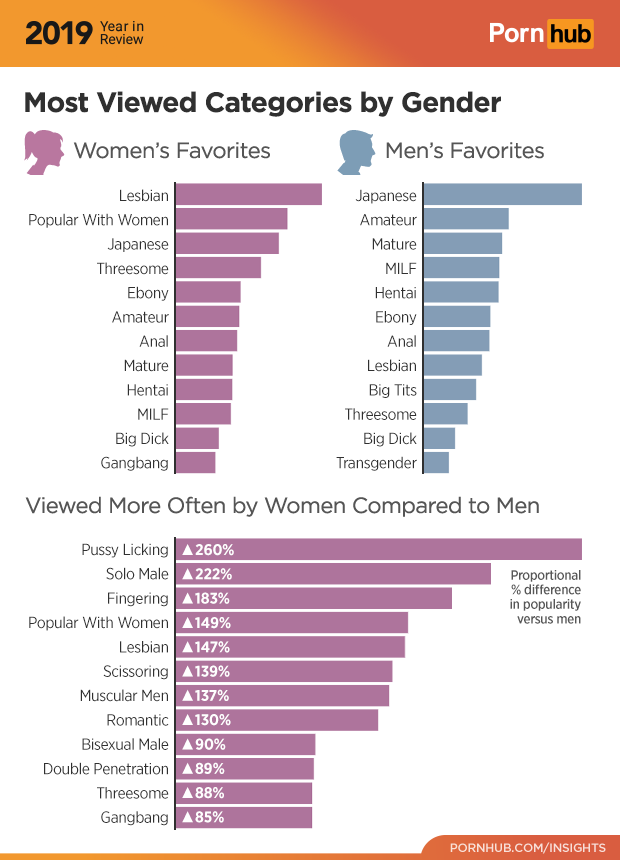 The type of porn watched by men and women tends to differ, with ‘Lesbian’ being the most popular category with women, while men tend to watch ‘Japanese’ videos the most. Both genders can agree on certain categories like ‘Threesome’ which ranks fourth for women but only tenth for men. ‘Mature’ ranks third for men but only eight for women.