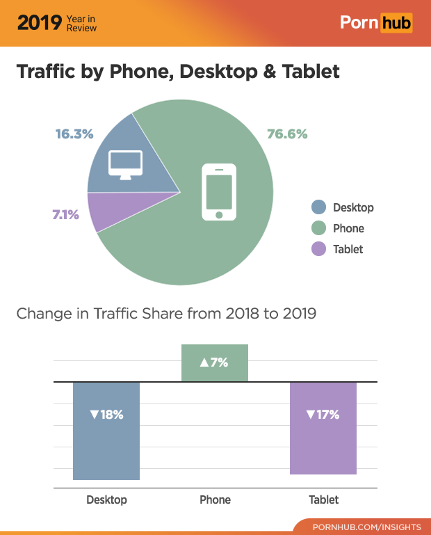 In 2019, mobile devices made up 83.7% of all Pornhub’s traffic worldwide. 76.6% of that traffic was from smartphones, which saw their share grow by 7%. The share of tablet traffic dropped by -17% to 7.1% while desktop and laptop computers decreased by -18% to make up only 16.3% of worldwide traffic.