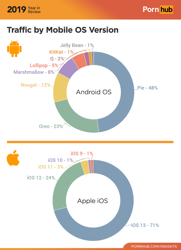 Among desktop web browsers, Chrome still made up more than half of Pornhub’s traffic, but actually decreased 2% in 2019 while Safari saw it’s share gain 13%. Internet Explorer’s share dropped by 13% while Microsoft’s more modern Edge browser grew by 9%.
