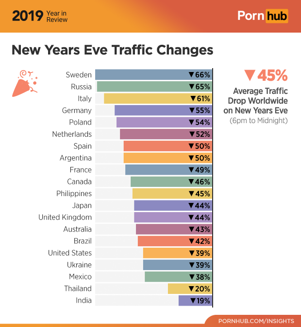 Worldwide traffic dropped an incredible -45% last New Years Eve from 6pm to Midnight (adjusted for all time zones) as people were celebrating the kick-off to 2019. Of all our Top 20 Traffic Countries, Sweden once again takes the cake for having the biggest traffic drop of -66% followed by Russia at -65%.