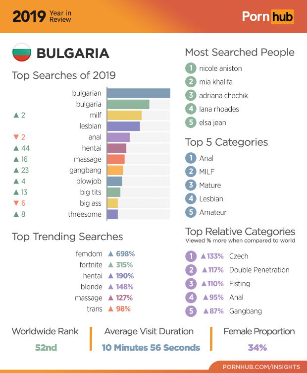 Bulgaria ranks 52nd for the most traffic to Pornhub, with 34% of visitors being female and the average visit during being 10 minutes 56 seconds. The top 2 searches remain ‘Bulgarian’ and ‘Bulgaria’ for another year, with ‘femdom’ (female domination) growing by 698% and ‘hentai’ by 190%. ‘Anal’ is the category of video most often viewed, but when compared to the rest of the world, Bulgarians are 117% more likely to view ‘double penetration’, 110% more into ‘fisting’ and 87% more into ‘gangbang’.