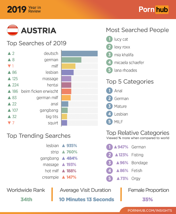 In 2019, Austria’s rank increased from 35th to 34th most trafficked country to Pornhub while time on site also grew by 11 seconds to 10 minutes and 13 seconds. The most searched term was ‘Deutsch’, up 2 from 2018, followed by ‘German’ which moved up 8 positions. One of the year’s biggest increases was ‘lesbian’ which increased by 935%. When compared to other countries, vistors from Austria are 123% more likely to view the ‘fisting’ cateogry, 96% more into ‘bondage’ and 86% more into ‘fetish’ videos. Austria’s proportion of female visitors increased by 5 percentage points in 2019 to 35%.
