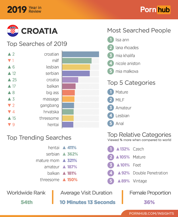 Worldwide, Croatia ranks 54th for traffic to Pornhub, with 36% of visitors being female and the average visitor spending 10 minutes and 13 seconds on the site. Croatia’s top search in 2019 was ‘Croatian’, up 2 spots from 2018. It’s clear that homegrown porn is popular, with ‘Croatia’ and ‘Hrvatska’ also making the list. Searches for ‘hentai’ were up 411% compared to the previous year, along with a 321% increase for ‘mature mom’. The most viewed category of video is ‘mature’, which is also 105% more likely to be viewed in Croatia when compared to other countries. Croatians are also 101% more into ‘feet’ videos and 91% more into ‘vintage’ videos.