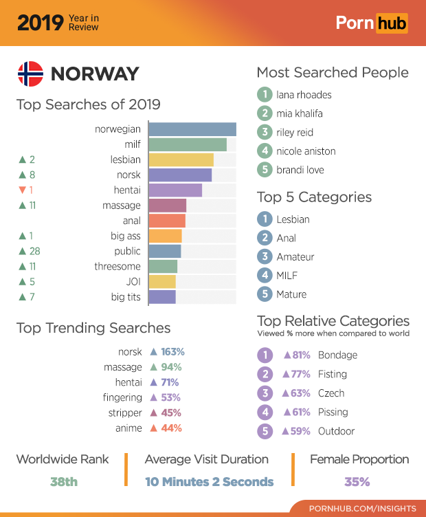Norway ranks 38th worldwide for traffic coming to Pornhub, with 35% of visitors being female and the average visit duration being 10 minutes and 2 seconds. The two most popular searches remained ‘Norwegian’ and ‘MILF’ for another year, but ‘lesbian’ move up 2 positions and ‘Norsk’ up 8, growing by 163% over the last year. When compared to other countries, visitors from Norway are 81% more likely to view the ‘bondage’ category, 77% more into ‘fisting’ and 63% more into ‘Czech’ porn.