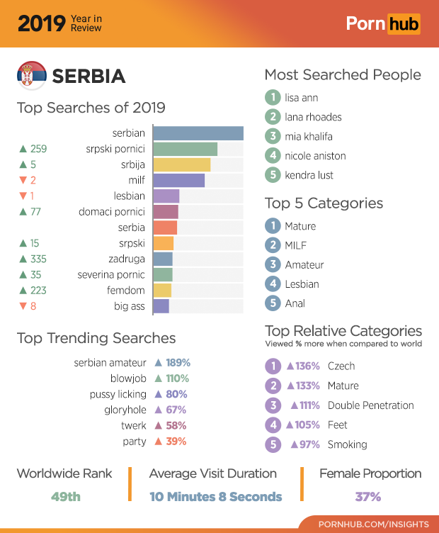 Serbia ranks 49th worldwide for traffic to Pornhub, with 37% of visitors being female and the average visiting length lasting 10 minutes 8 seconds. ‘Serbian’ remained the number 1 search for another year, followed by ‘Srpski Pornici’ which gained 259 spots in the past year. Compared to 2018, searches for ‘Serbian amateur’ grew by 189%, and ‘blowjob’ by 110%. ‘Mature’ is the most viewed category in Serbia, which is 133% more likely to be viewed when compared to other countries. Serbians are also 136% more likely to view ‘Czech’ videos and 111% more into ‘double penetration’.