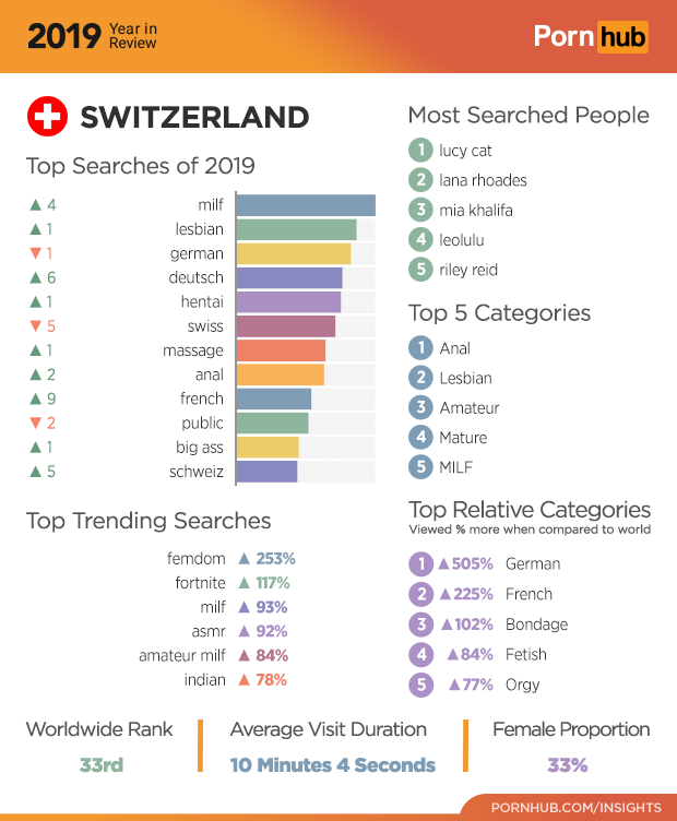 Switzerland ranks 33rd for traffic coming to Pornhub, with 33% of visitors being female and the average visit length being 10 minutes 4 seconds. We found a lot of movement in Switzerland’s top search list this year, with ‘milf’ moving up 4 spots, ‘deutsch’ up 6 and ‘french’ up 9. Searches for ‘femdom’ (female domination) grew by 253% over the past year, and ‘Fortnite’ by 117%. While ‘Anal’ is the most viewed category in Switzerland, visitors are 102% more likely to view the ‘bondage’ category, and 84% more into ‘fetish’ when compared to the rest of the world.