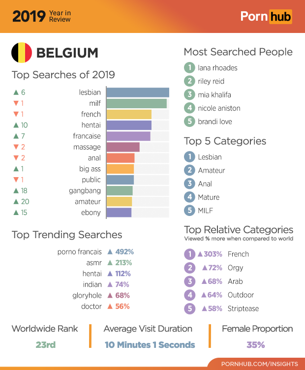 Belgium ranks 23rd for traffic coming to Pornhub, with the average visitor spending 10 minutes 1 second and 35% being female. The most searched for term of 2019 was ‘lesbian’, up 6 spots versus the previous year. Searches for ‘hentai’ grew by 112% and moved up 10 spots to become the fourth most searched term, and ‘asmr’ searches grew by 213%. Visitors from Belgium are 303% more likely to view the ‘French’ category, 72% more into ‘orgy’ videos and 64% more into ‘outdoor’.