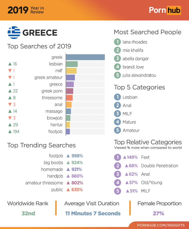 Greece ranks 32nd for traffic coming to Pornhub, with the average visit lasting 11 minutes 7 seconds, and 27% of the traffic being female. The most searched term by a large margin is ‘Greek’, followed by ‘lesbian’ which moved up 16 positions in 2019. Searches for ‘footjob’ grew by 998%, along with a 924% increase for ‘big boobs’ and 921% for ‘homemade’. Visitors from Greece are 149% more likely to view the ‘feet’ category when compared to the rest of the world, as well as 68% more into ‘double penetration’ and 62% more into ‘anal’ videos.