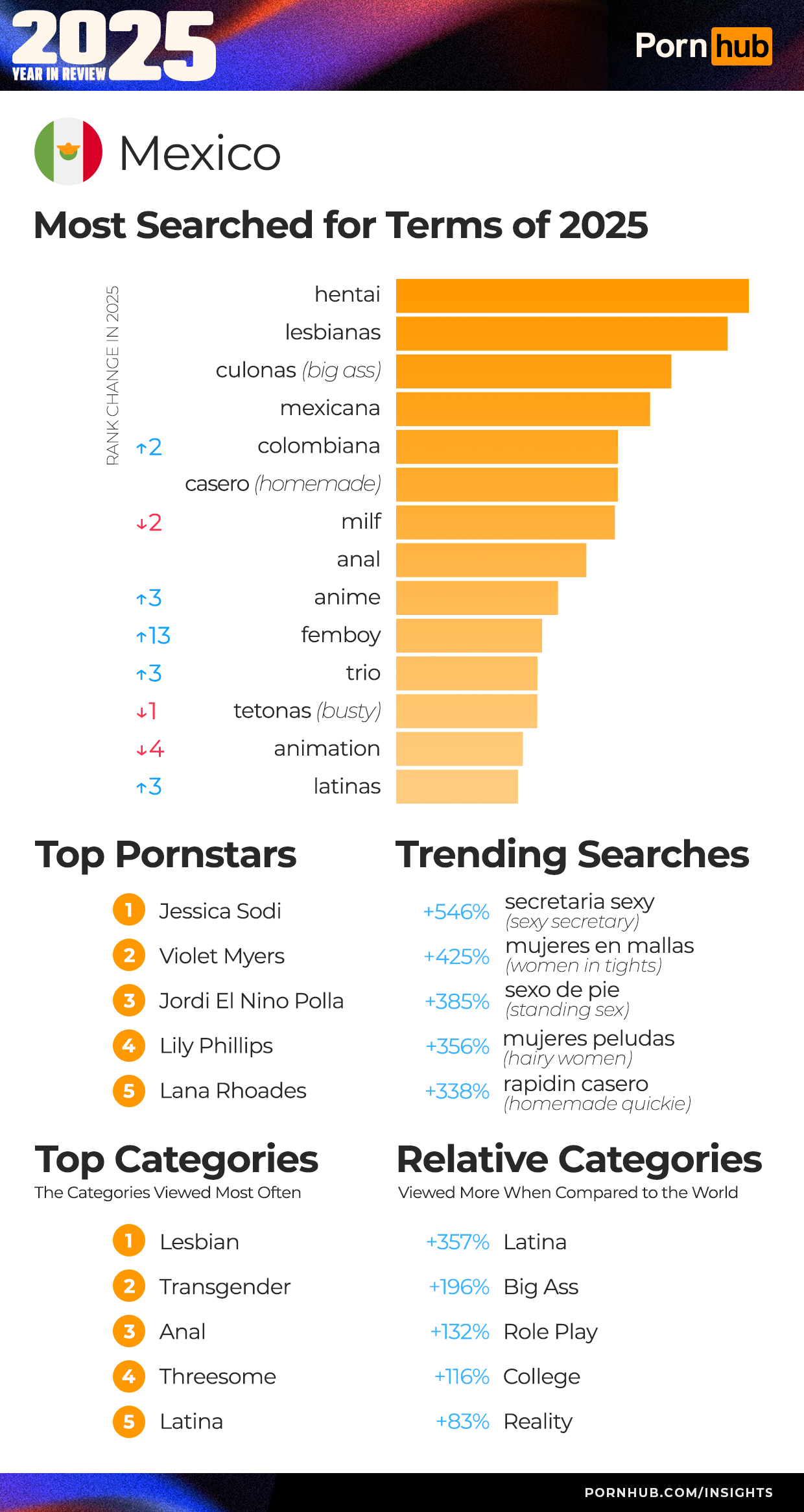 Argentina’s top search terms didn’t change much this year. Searches for “argentina” took the lead again this year by a landslide, followed by “hentai” in 2nd, “lesbianas” in 3rd, “milf” in 4th, and “anal” in 5th, up +2 spots from last year. Following 2025’s defining trend of femboy interest, the term also jumped +5 spots in Argentina this year. “en español” also saw an increase of +7.