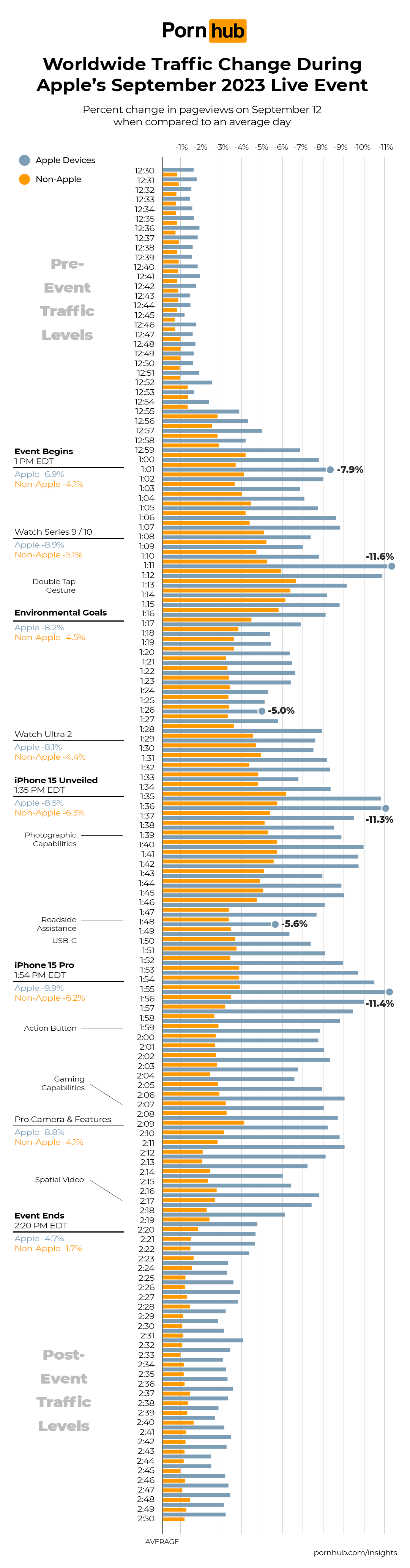 Every year Apple’s big event is streamed online, grabbing the attention of millions of people across the world. They tune in to see the latest iPhone models, Apple Watch models, and other developments in technology and gadgets. Naturally, an event of this much interest influences Pornhub traffic, so our friends at Mashable asked Pornhub statisticians to take a deeper look at the changes that occurred during the big event compared to an average day.