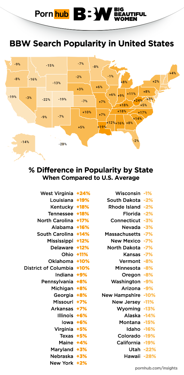 BBW searches are the least popular in Hawaii, Utah, California and Colorado.