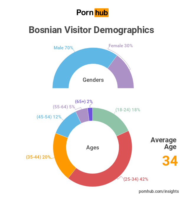 30% of visitors from Bosnia are female, which is higher than the worldwide average of 26%. The average age of Bosnian visitors is 34 years old, with the 25 to 34 age group making up 42% of all visitors.