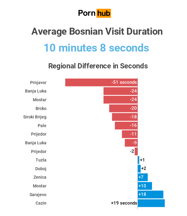 The average visitor from Bosnia spends 10 minutes and 8 seconds on Pornhub. Visitors from Prnjavor come and go 51 seconds faster, while those from Cazin hold out 19 seconds longer than the average Bosnian.