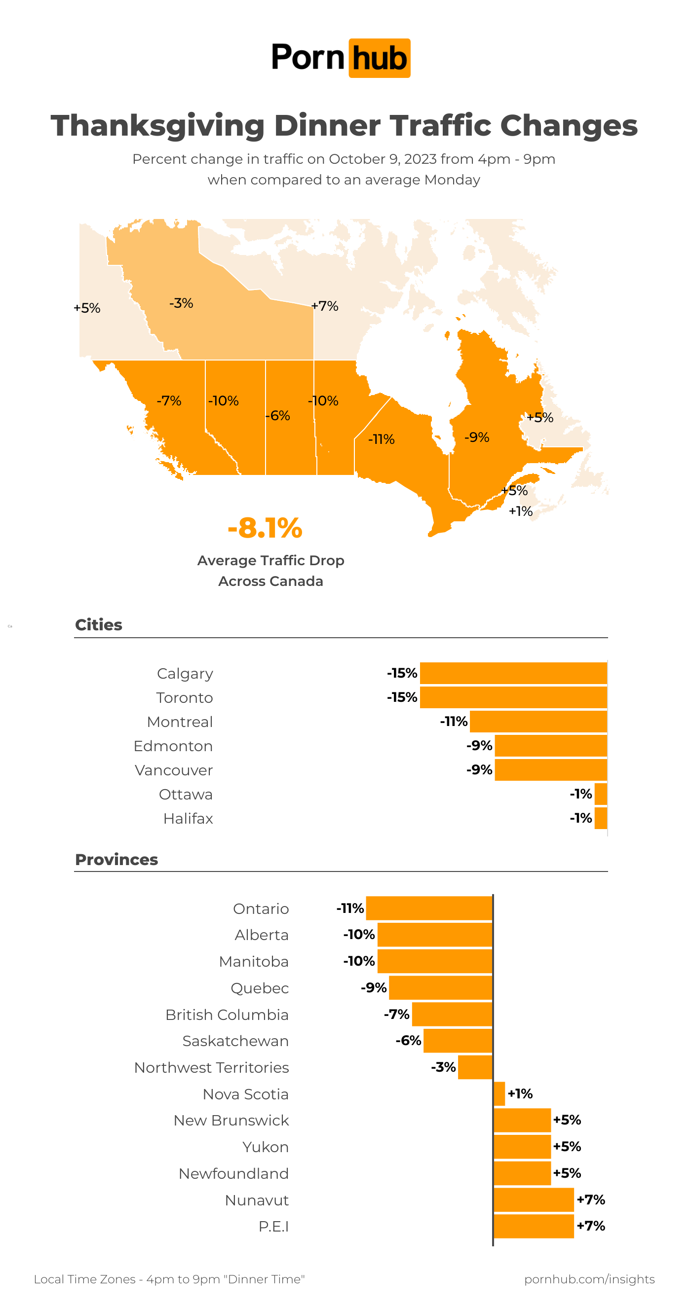 Next, our statisticians broke down the percent change in traffic by Canadian provinces on Thanksgiving Day around dinner time (4 pm – 9 pm), adjusted for local time zones.