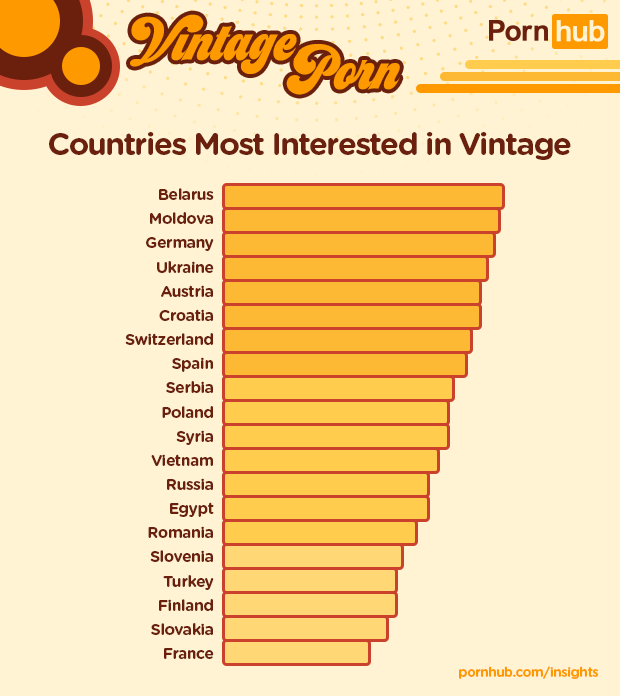 The countries most often searching for vintage porn are primarily in Europe. Belarus tops the list of vintage enthusiasts, followed by Moldova and Germany.