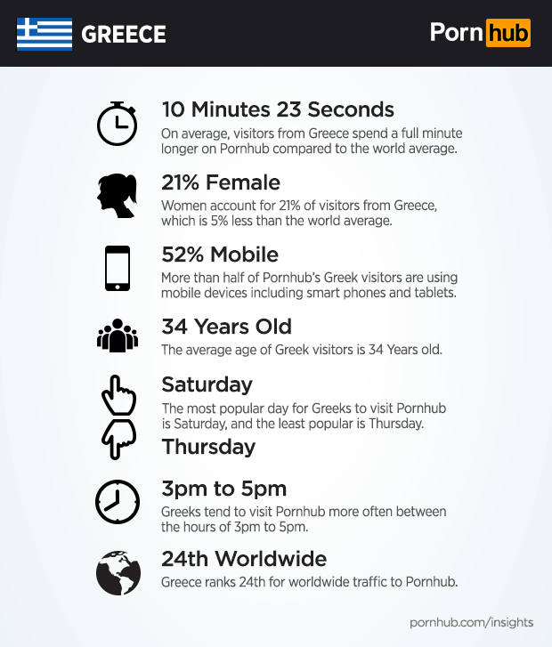 One of the biggest changes in Greece is average visit times, which have increased from 9 minutes in 2015 to 10 minutes and 23 seconds in 2017, exceeding the worldwide average by nearly a full minute. A unique aspect of Greek porn usage is the most popular time of day to visit Pornhub. Most countries tend to visit later at night from 10pm to midnight, but in Greece the most popular time remains 3pm to 5pm.