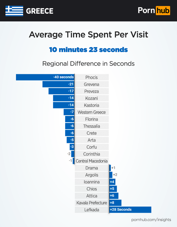 While the average Greek visitor will spend 10 minutes and 23 seconds on Pornhub, some regions are much faster or slower. Visitors from Phocis are 40 seconds faster to come and go, while those in Lefkada take 28 seconds longer.