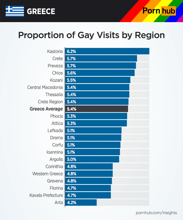 Around 5.4% of pageviews from Greece are for gay male content. We find a higher proportion of gay pageviews at 6.2% in Kastoria, and less at 4.2% in Arta.