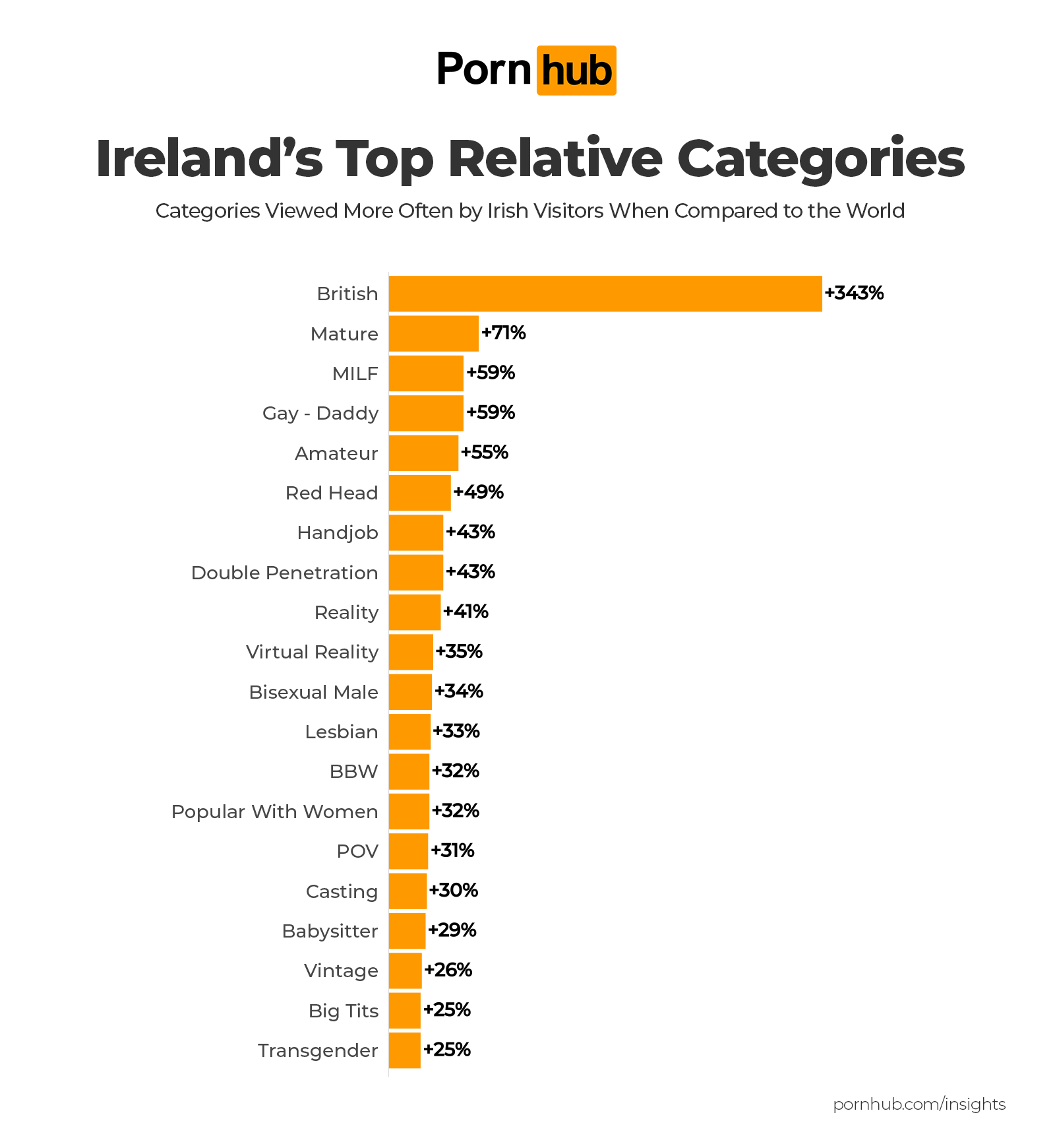 For top relative categories, the Irish showed a particular interest in British with +343% higher average views than elsewhere in the world. After that, the numbers were less extreme, with Mature at +71%, Milf at +59%, and the gay category, Daddy, at +59% as well.