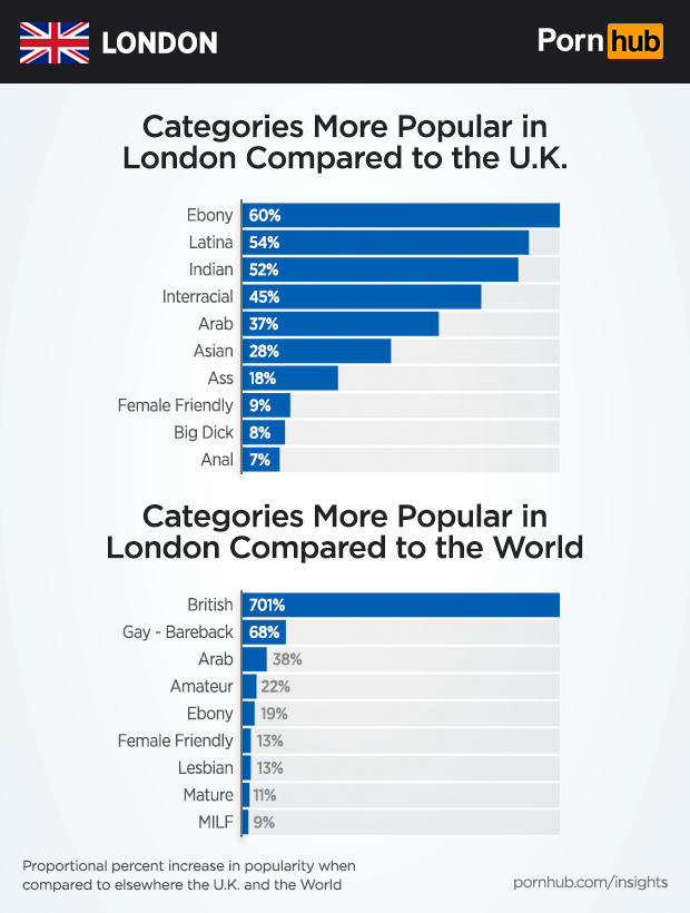 When compared to the rest of the world, visitors from London are 701% more likely to view the British category. The Gay Bareback category is 68% more popular in London, as well as the Arab and Amateur categories.