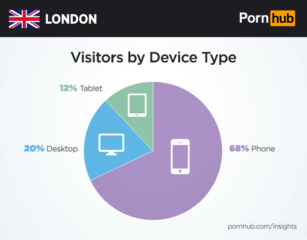 80% of Londoners are using mobile devices to visit Pornhub, with smartphones in particular being 8% greater than the U.K. average usage of 60%.