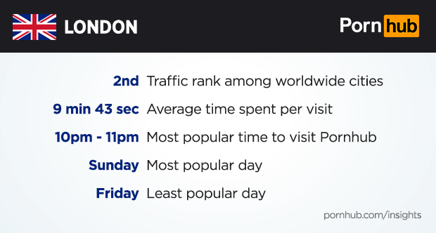 On average, visitors from London spend 9 minutes and 43 seconds each time they visit Pornhub, just 3 seconds longer than the U.K. average and 7 more than the world. Like most parts of Europe, the most popular time of day for Londoners to visit Pornhub is 10pm to 11pm, and Sunday is the most popular day of the week.