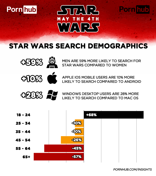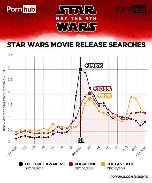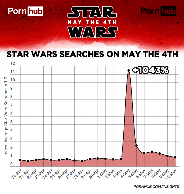Whether they favor the light side or the dark side, the force is strong with Pornhub users. Trusted Reviews asked the Insights team whether “Star Wars Day” affects viewership and searches. While our statisticians can’t see what side of the force our visitors favor, they do have a plethora of Star Wars related data on hand — in particular when May the 4th comes around. On that most geeky of all holidays, Star Wars related searches grow by an empire sized 10430% as visitors enjoy some Hand Solo action.