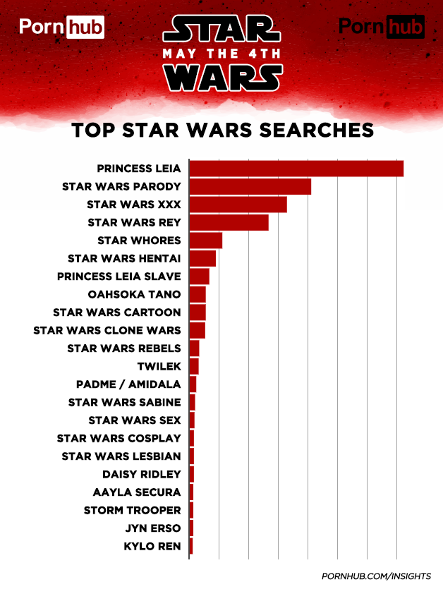 In particular, searches for “lightsaber” gain an impressive 766%, “star wars sex” 663% and “ashoka tano” 598%. Those are based on results from May the 4th, 2017.