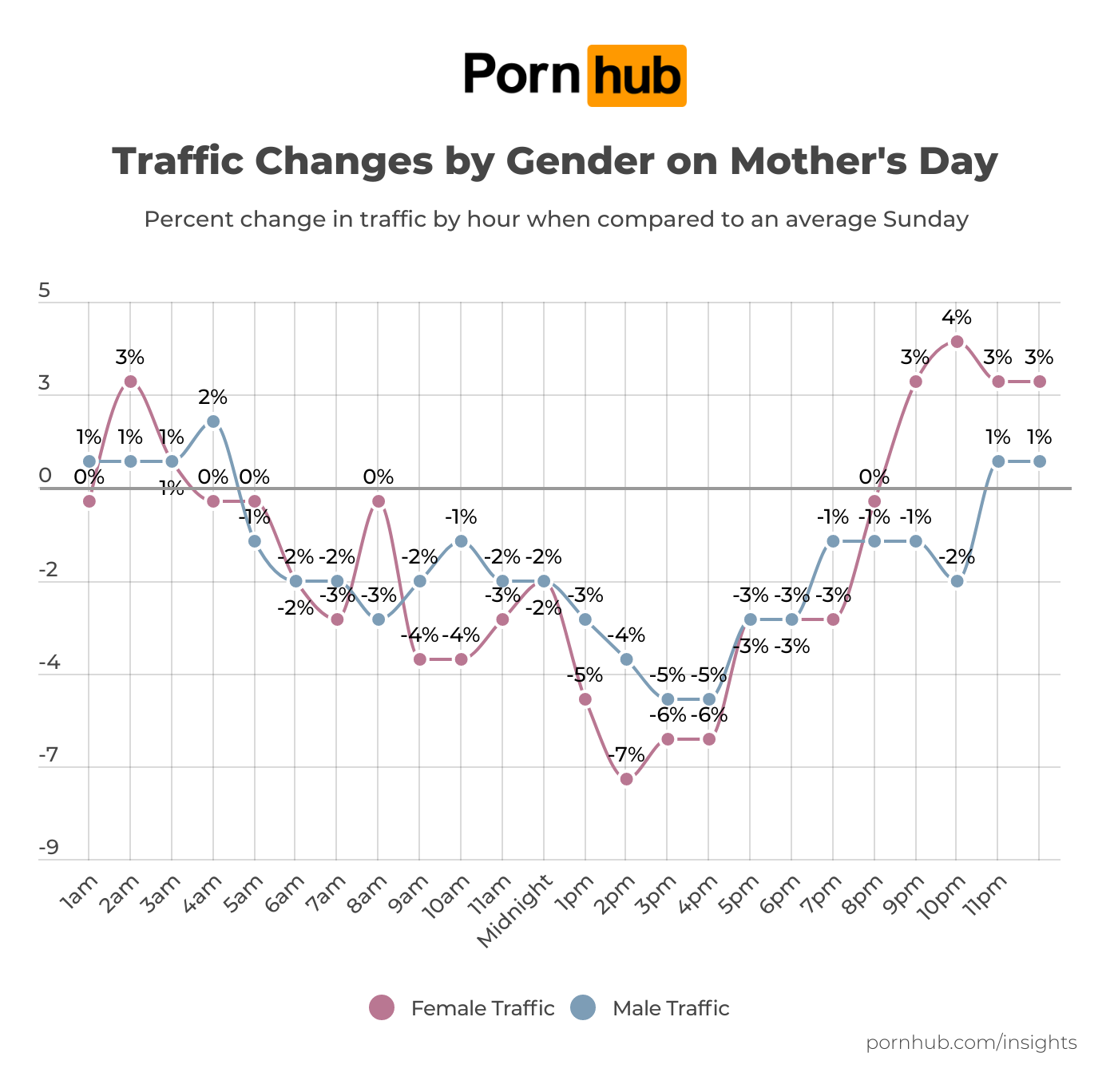 We then decided to break that number down by male and female visitors. The traffic for females was below average from about 6am until 9pm. Interestingly, we saw a spike of about +5% in female traffic at 10pm. We can only assume this indicates the moms in our lives finally had a minute of alone time on Pornhub after a busy day! In contrast to that, we also saw a steep decrease of about -6.5% in female traffic around 2pm.