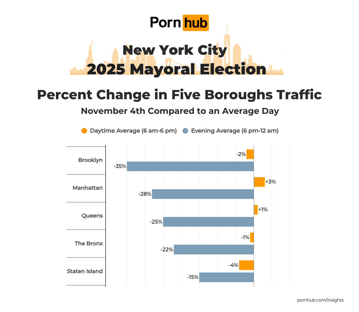 During the day, traffic to Pornhub was up +3% in Manhattan, and down the most in Staten Island, where it was –4% below average.