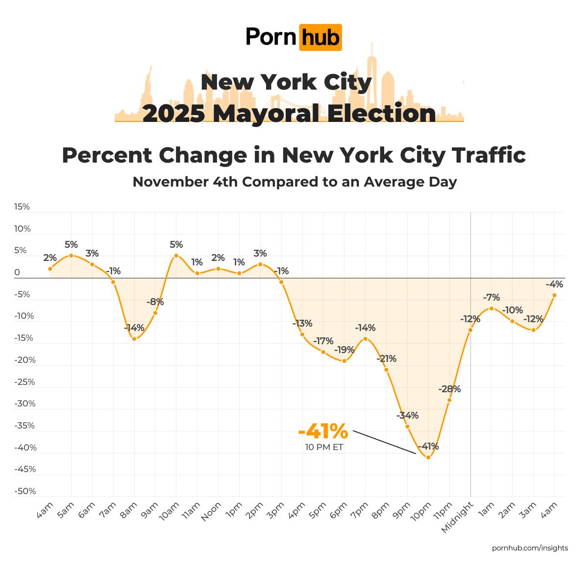 As one of our most active cities in the US, an election like this has a substantial effect on visits to Pornhub. So, when our friends at The New York Post asked our statisticians to pull some data, they were eager to analyze it and see what impact the action had on New Yorker’s browsing habits!