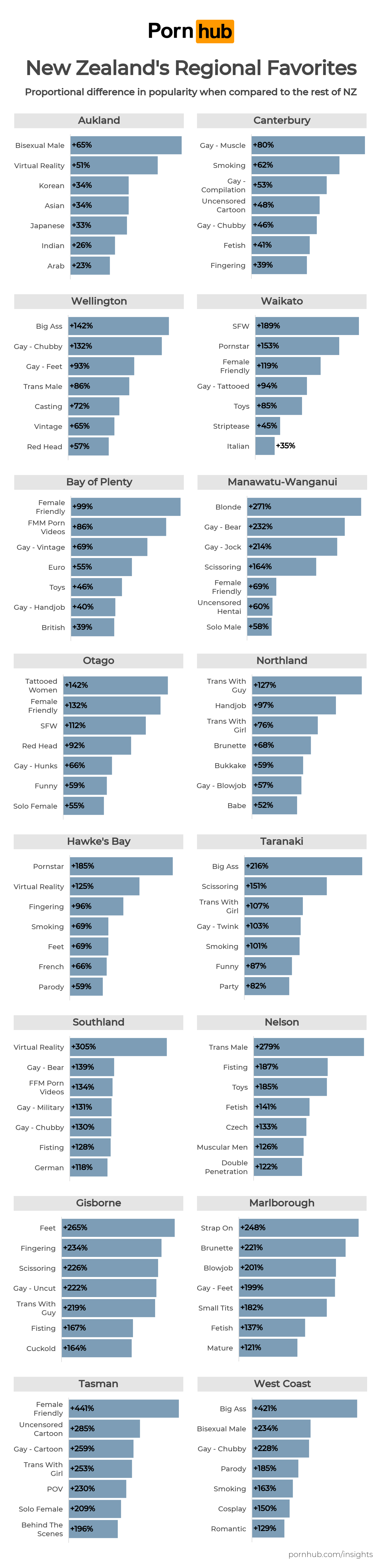 The following chart shows which categories are proportionately more likely to be viewed in New Zealand when compared to the rest of the world. Kiwis are +941% more likely to view Safe for Work content on Pornhub, +210% more into Female Friendly videos, and +111% more likely to watch Virtual Reality content.