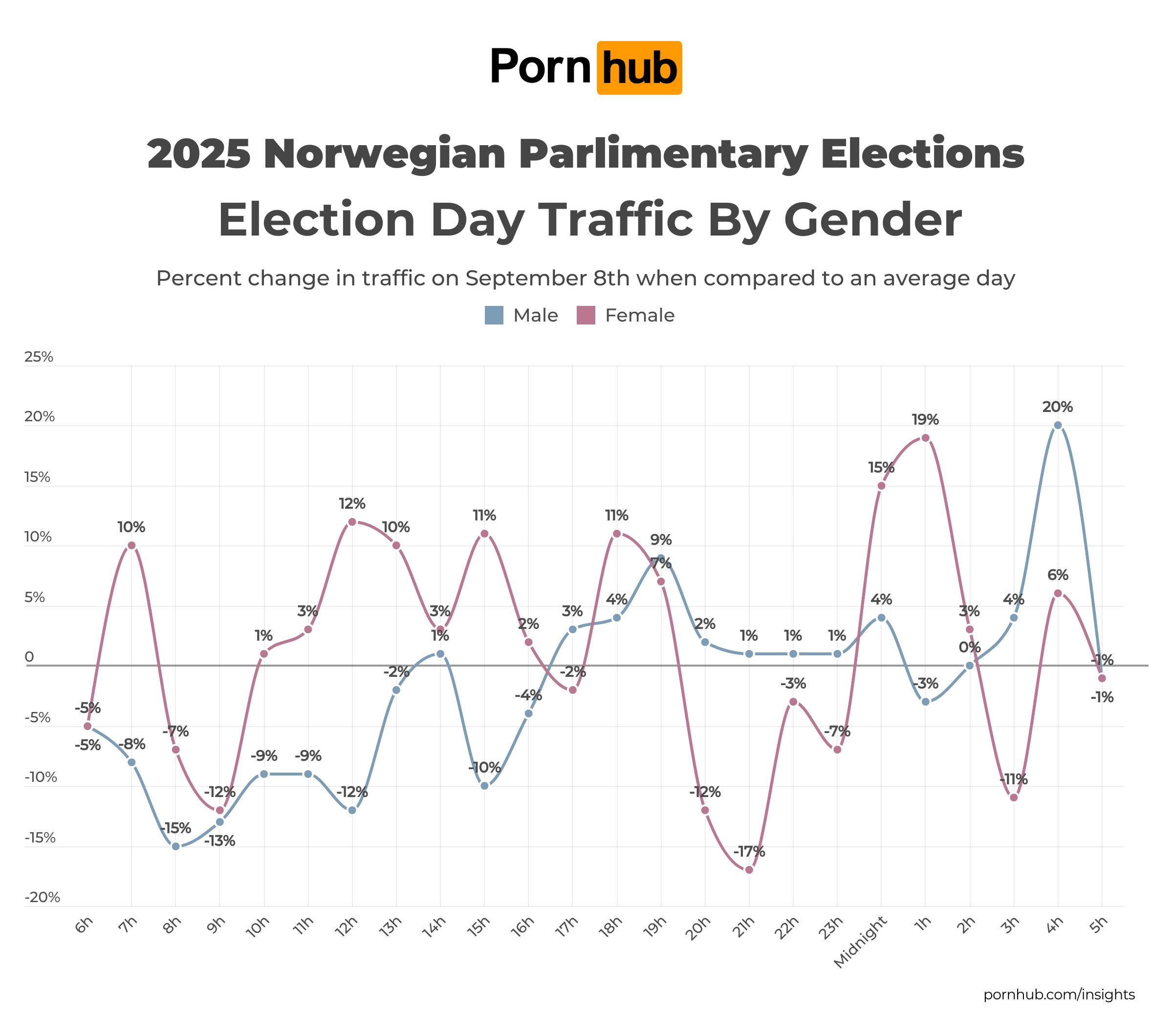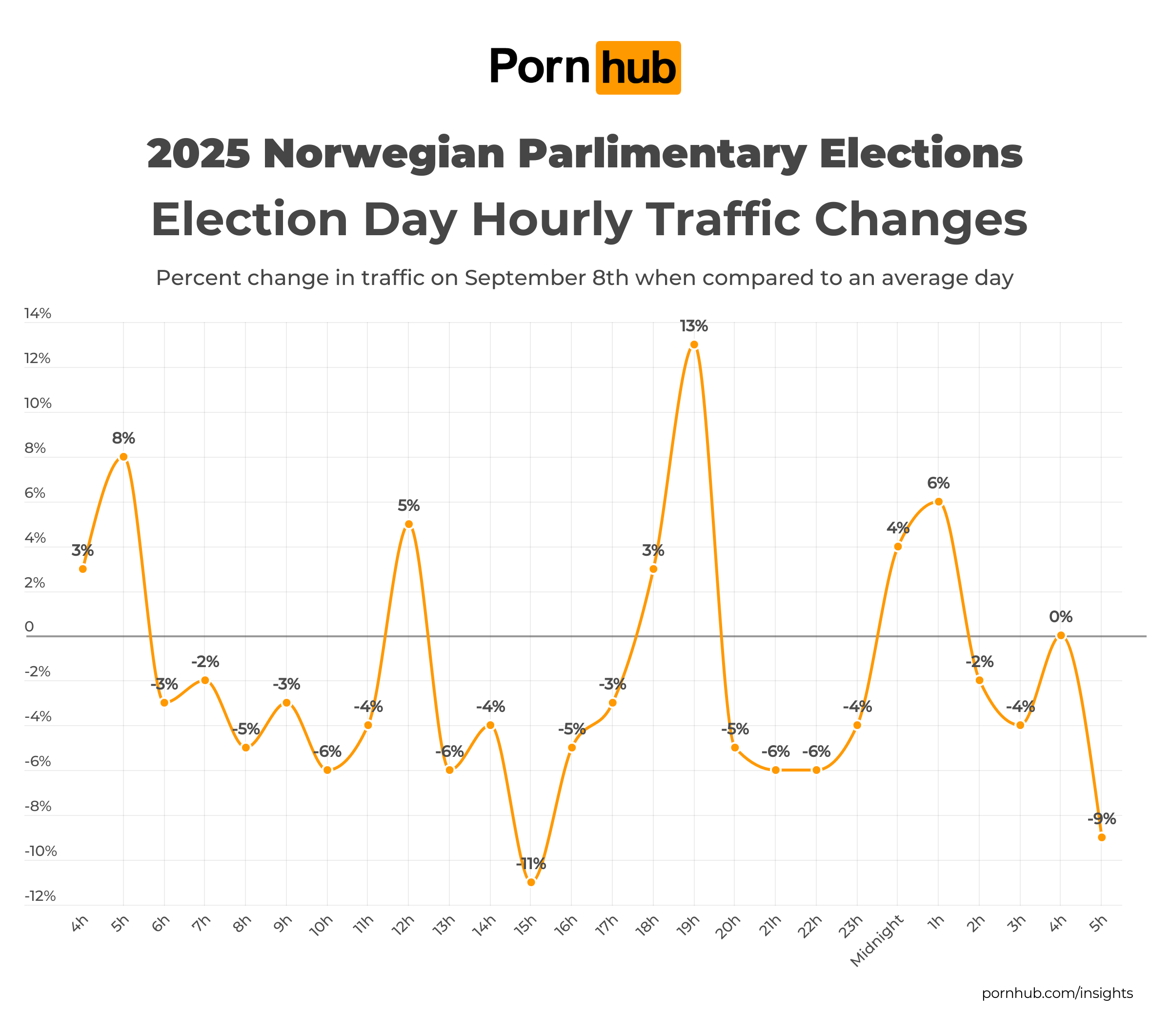On September 8, millions of Norwegians across the country took to the polls to vote in the parliamentary election. Naturally, an event of this scale impacts traffic to Pornhub, and when our friends at Nettavisen asked our statisticians to pull the data, they were happy to oblige.