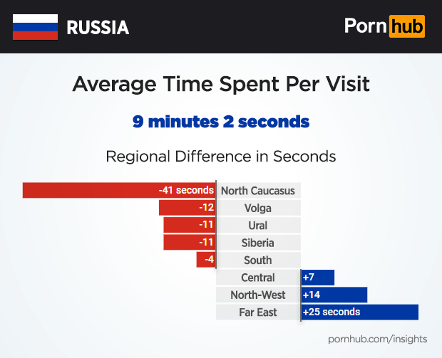 While the average Russian will spend just over 9 minutes visiting Pornhub, the time on site does vary greatly by region. Visitors from North Caucasus come and go 41 seconds faster, while people in Far East tend to last nearly half a minute longer.