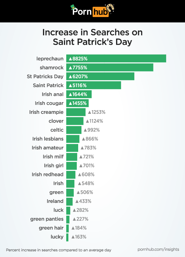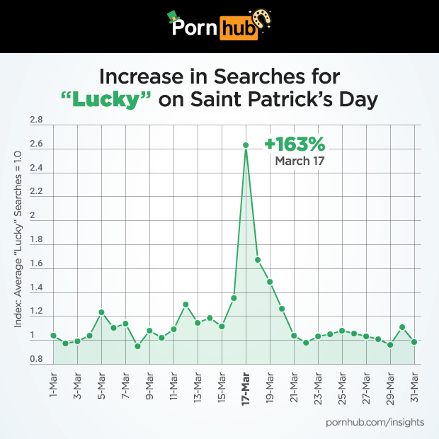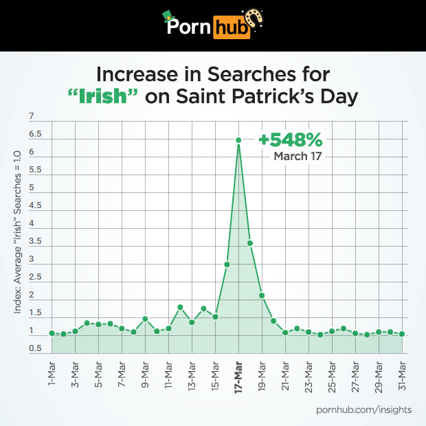 In honor of everyone’s favorite day to get lucky, Pornhub’s statisticians took a look at how Saint Patrick’s Day affects searches on Pornhub. After the results of our Christmas and Valentine’s holiday reviews, we were expecting a pot of statistical gold from Saint Pat, and we weren’t disappointed.